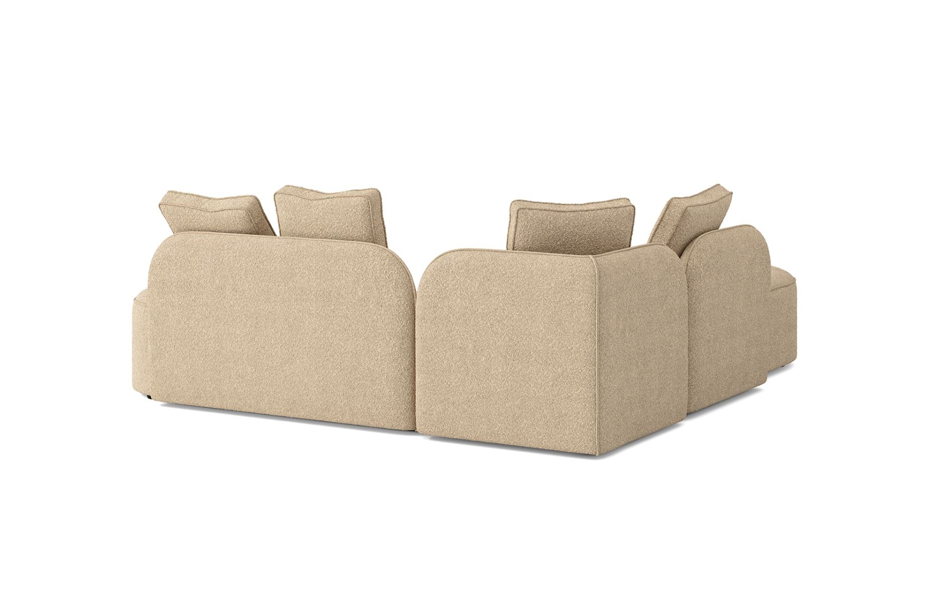 Caractéristiques Modularité à souhait, Assemblage des modules avec des pinces métalliques intégrées , Housse non déhoussable, Formes arrondies au niveau des dossiers et des assises, Salon proposé dans un revêtement en toile bouclette acrylique traitée anti-taches