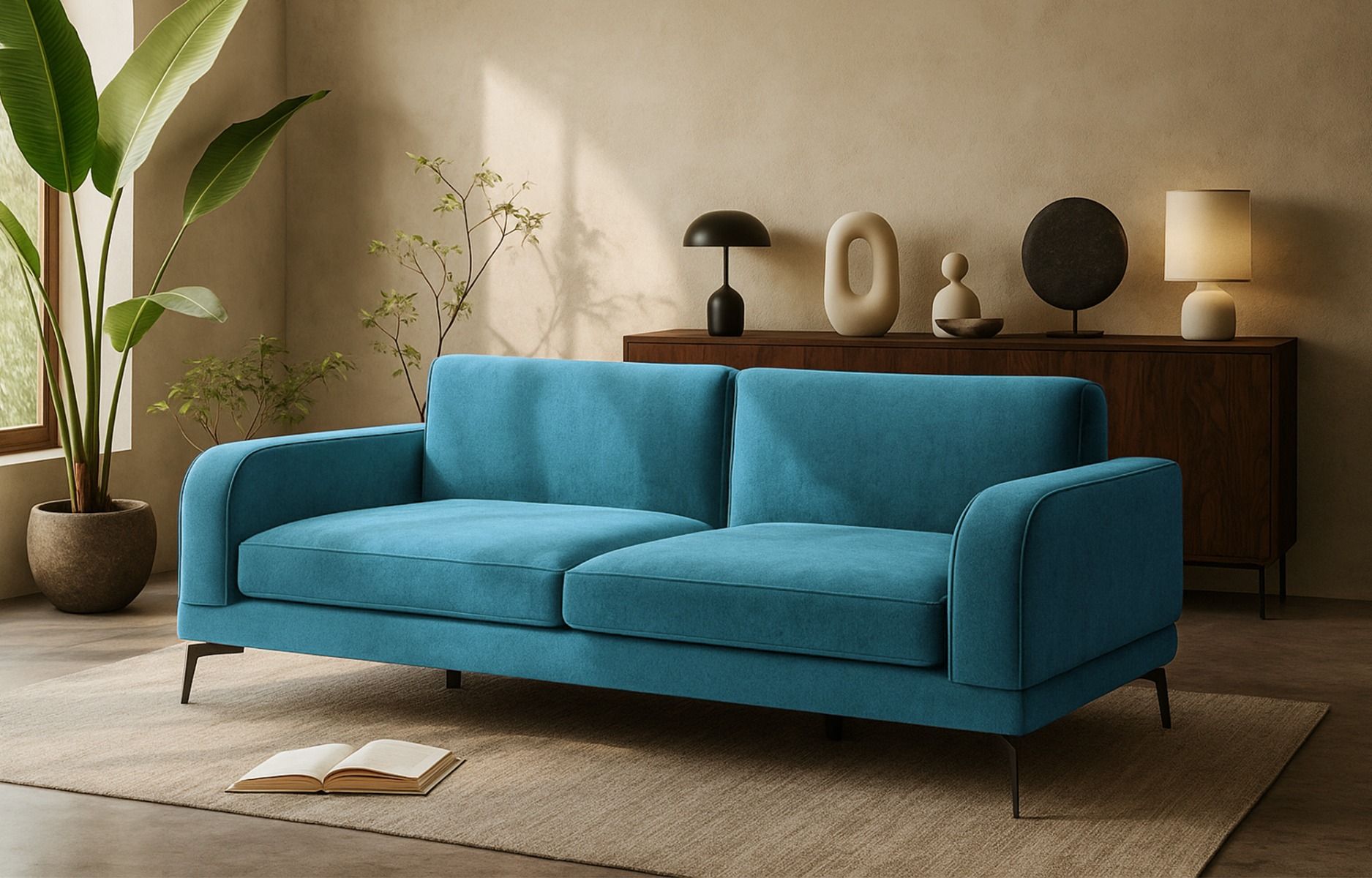 Dans un style moderne, ce canapé arbore une allure sobre et élégante avec son revêtement en tissu de velours bleu niagara, une couleur appréciée dans les intérieurs actuels, ajoutant une touche d'élégance à votre salon.
