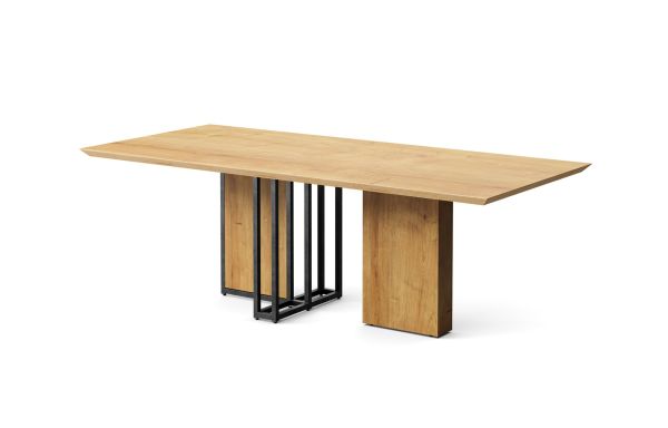 Le fameux plateau de la table Baxter est posé sur une œuvre d’art ! Un mix de piétements design mettant en valeur 2 matériaux différents: un pied métallique incrusté d'un panneau en bois décor chêne naturel et un pied en bloc de bois fin décor chêne naturel. Ces deux matières naturelles s’accordent parfaitement pour faire de votre salle à manger un antre de modernité.